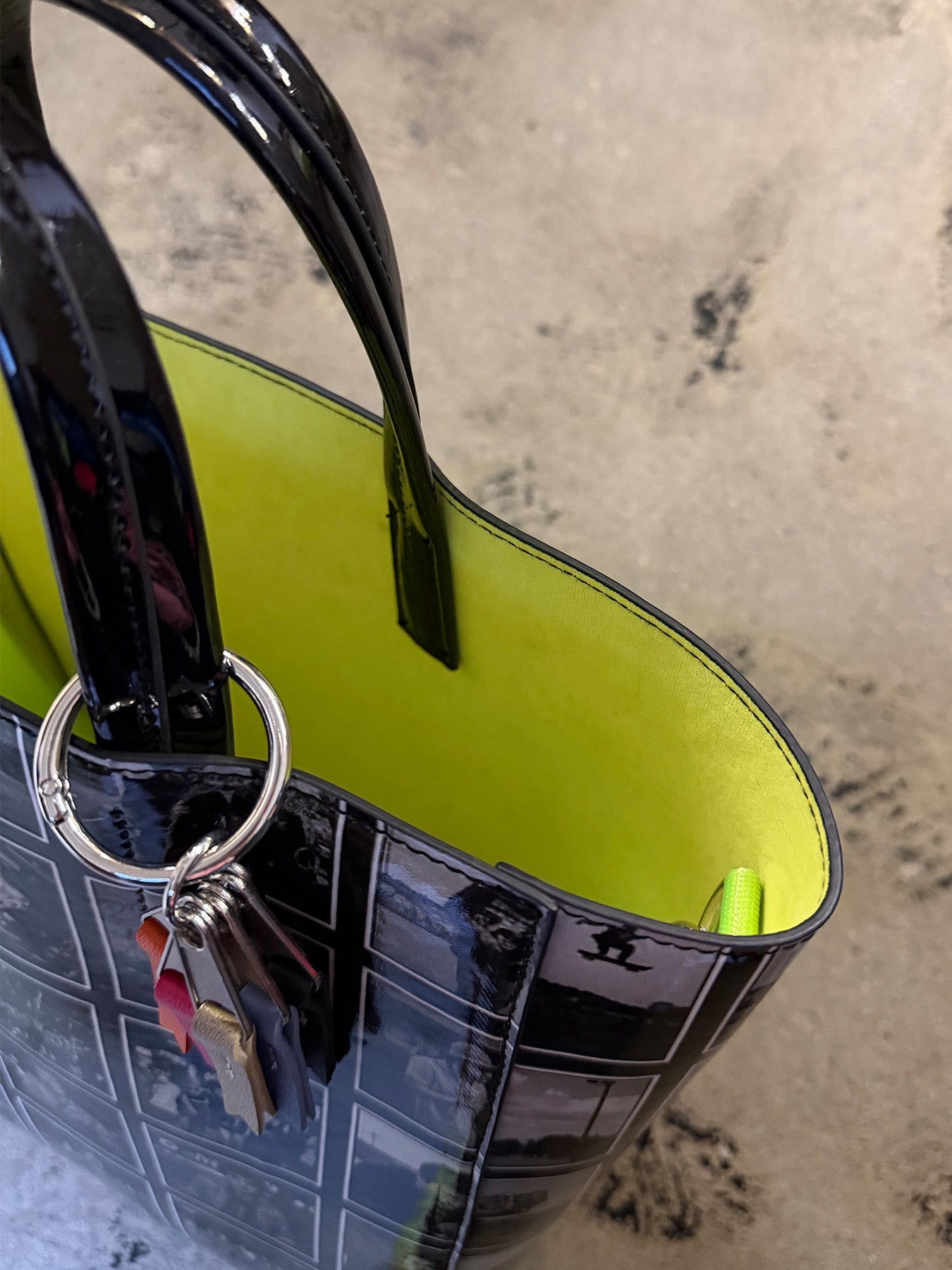 ハンドルには光沢のあるエナメル生地を使用し、ツヤ感アップ。