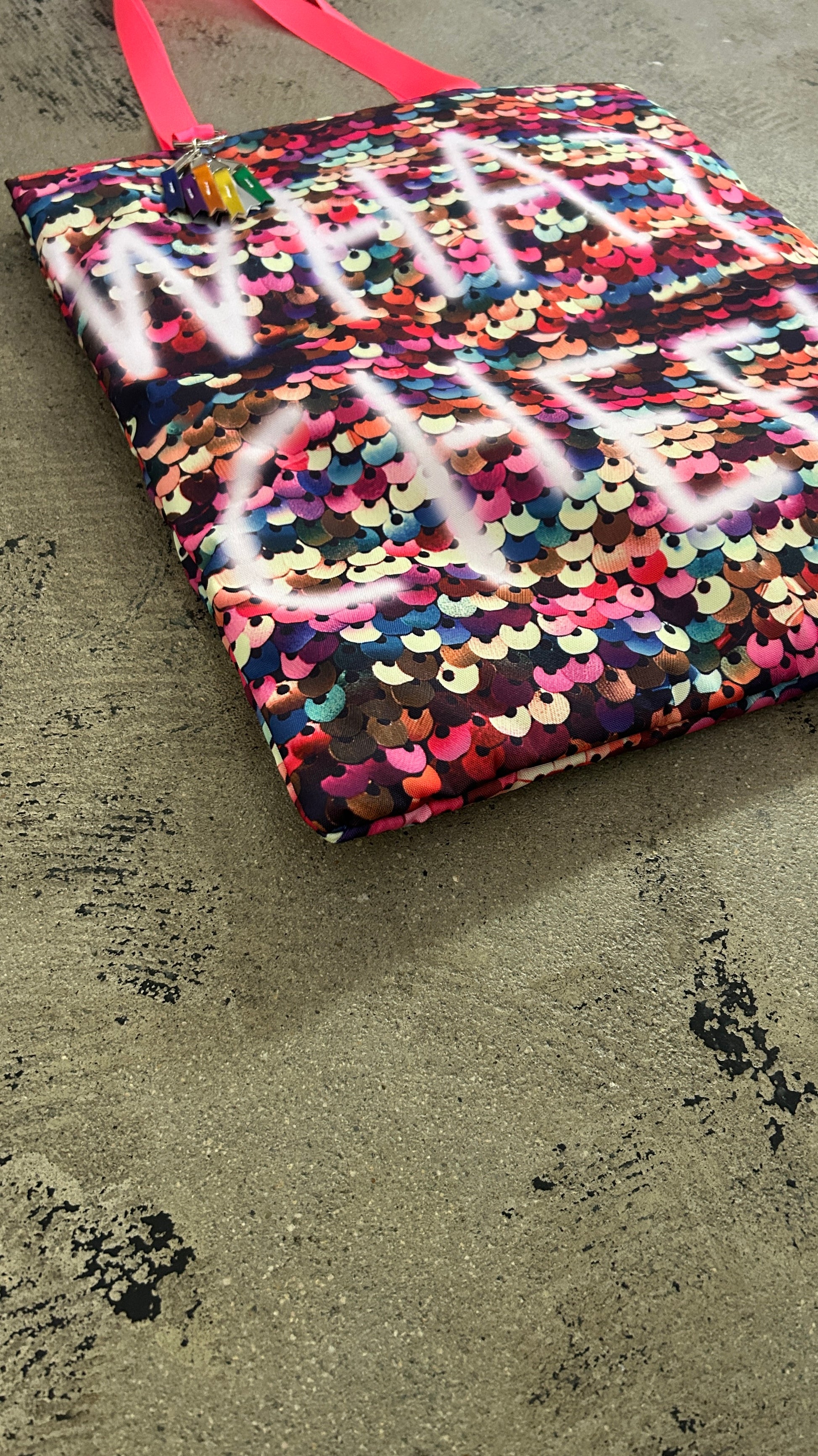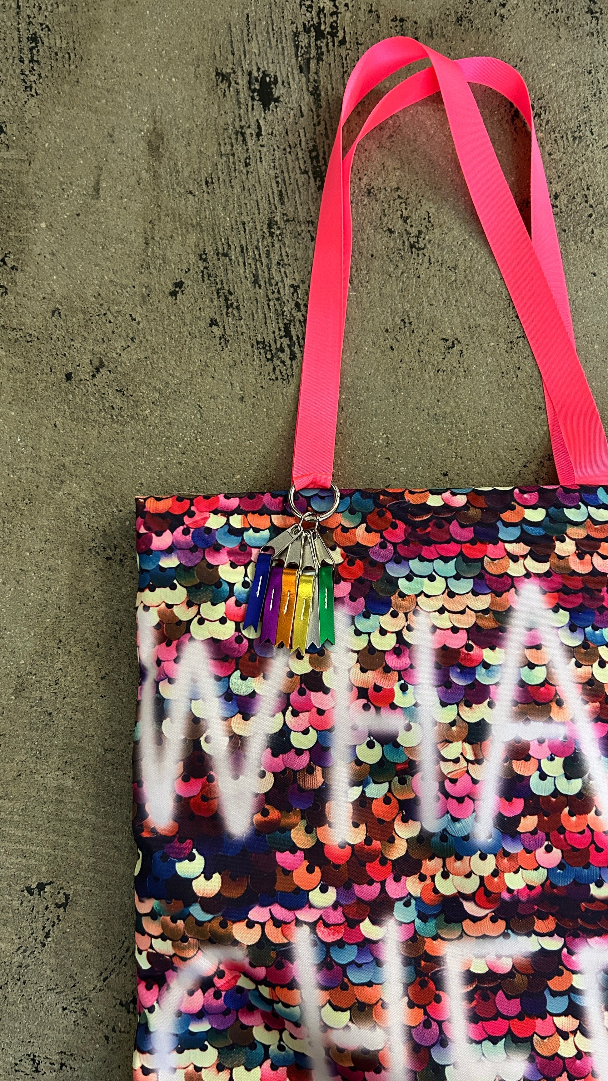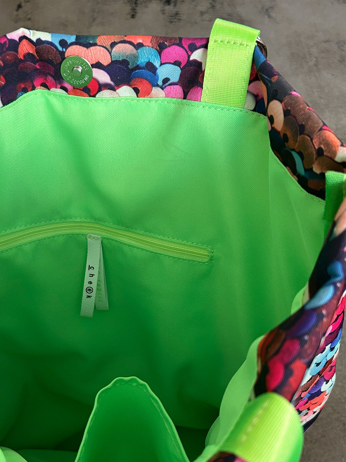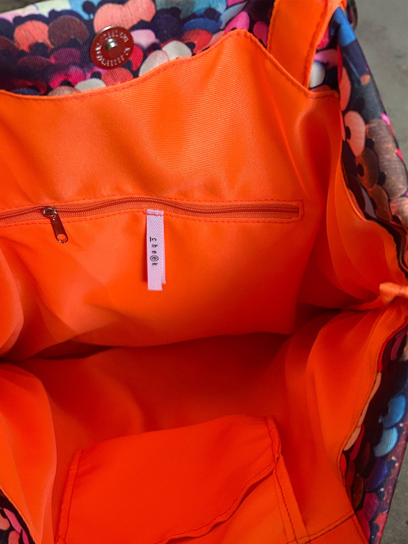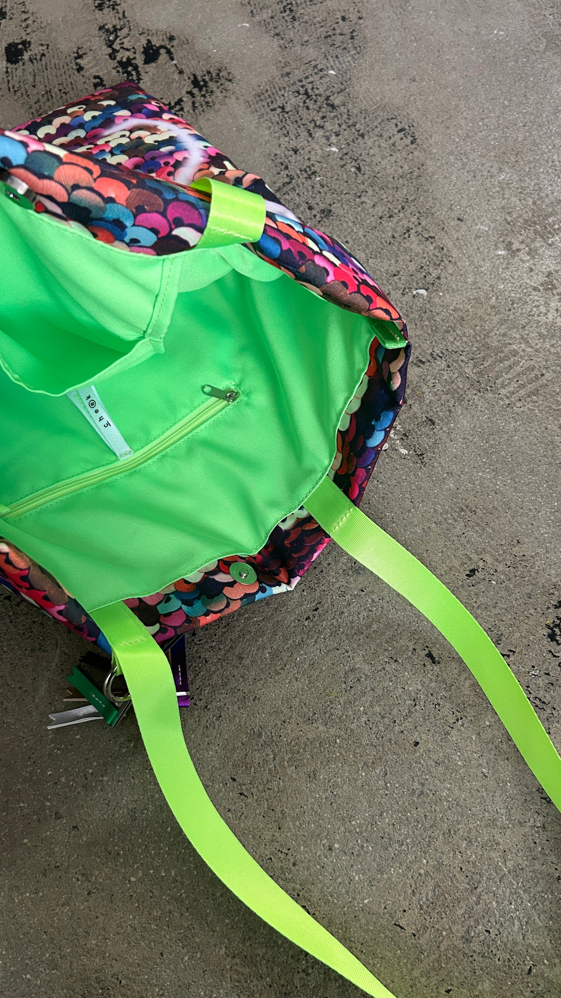 サイズは大容量でネオンカラーテープのハンドルは肩掛けできるように