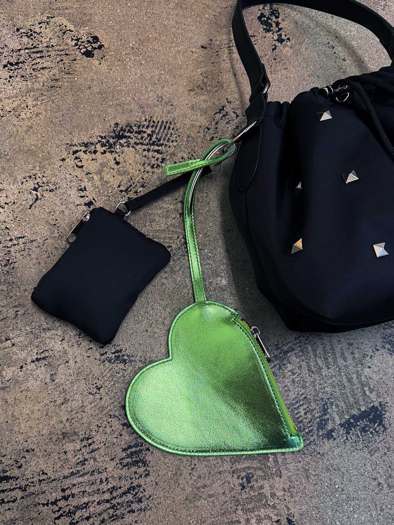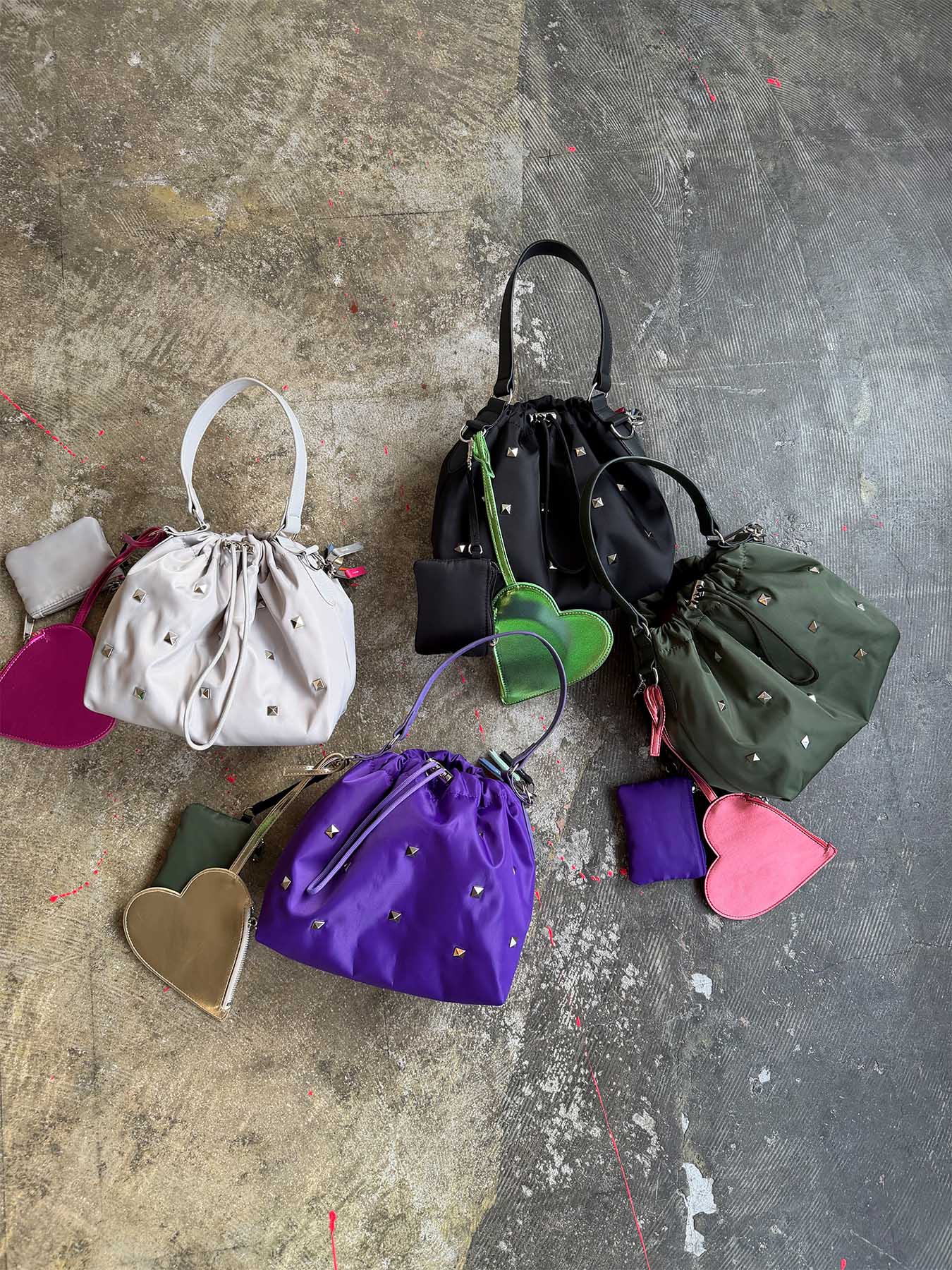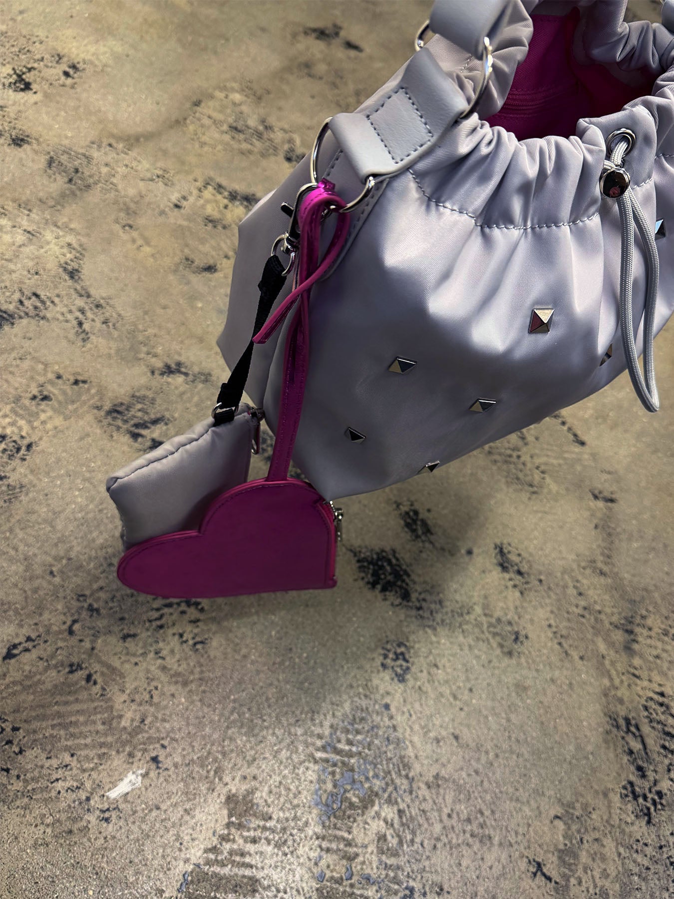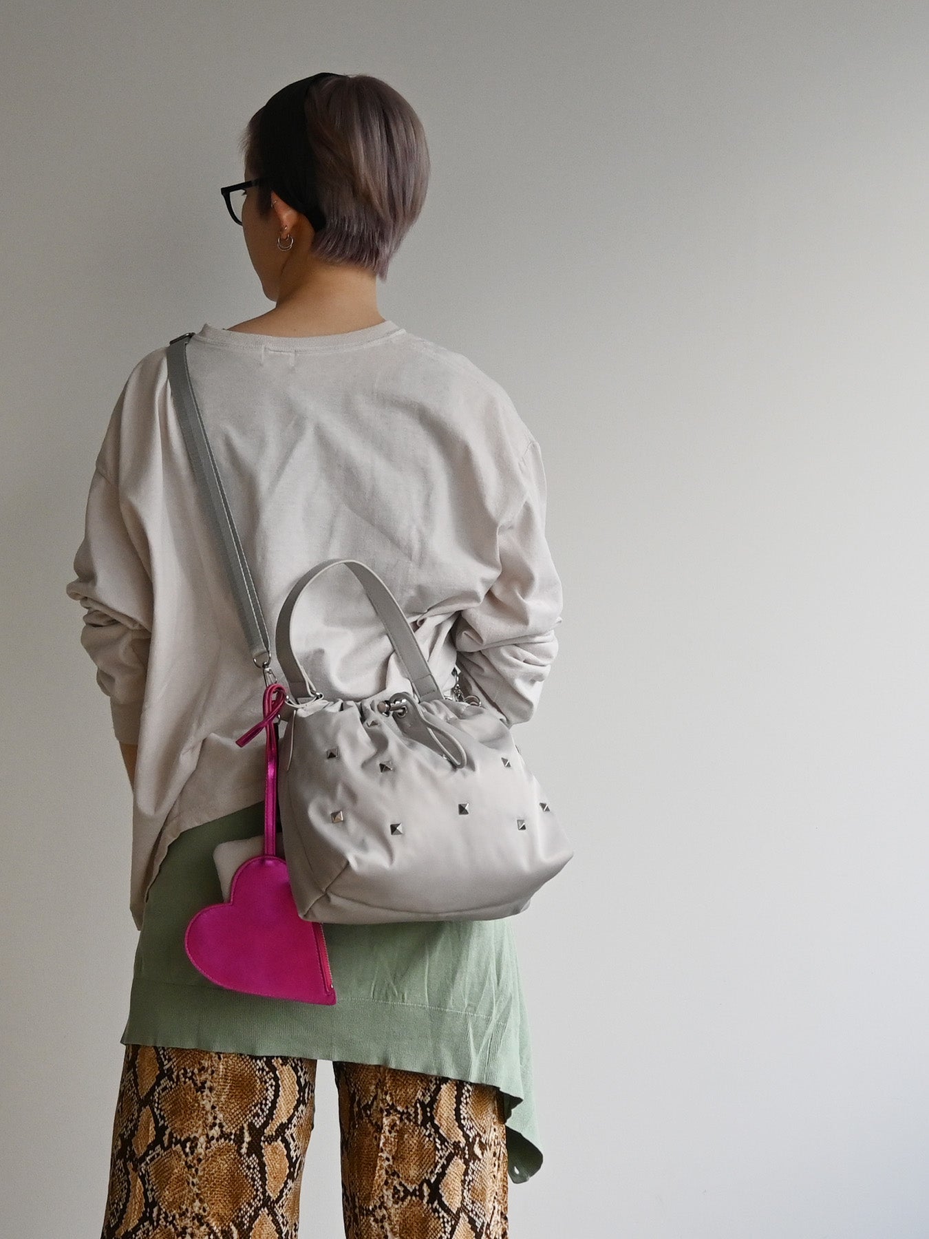 キュンとするハートチャームとピリッとクールなスタッズが組み合わさった2WAYバッグ。