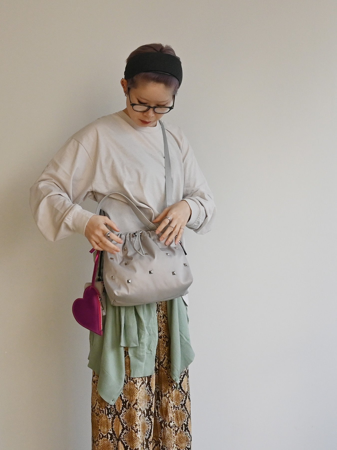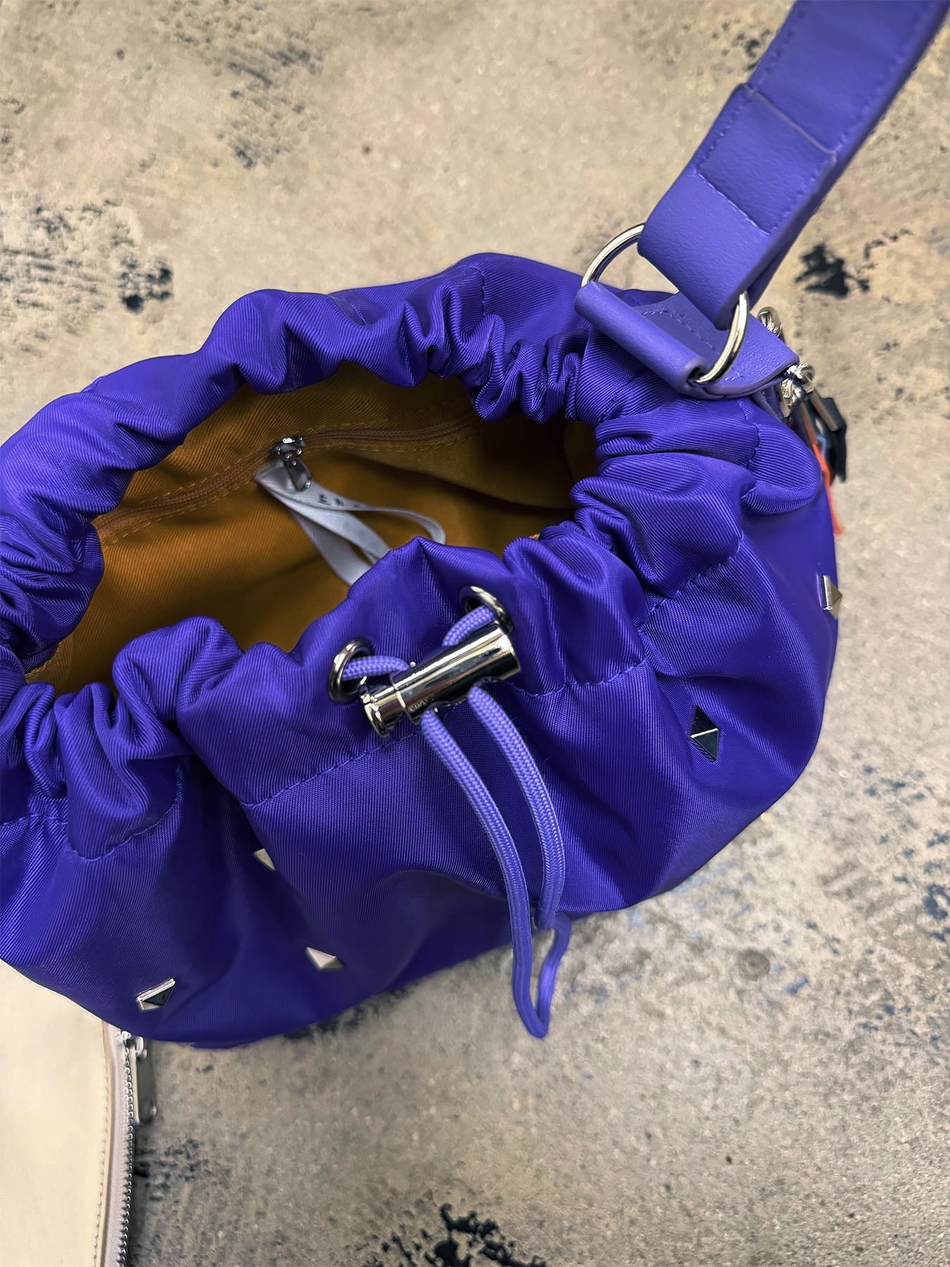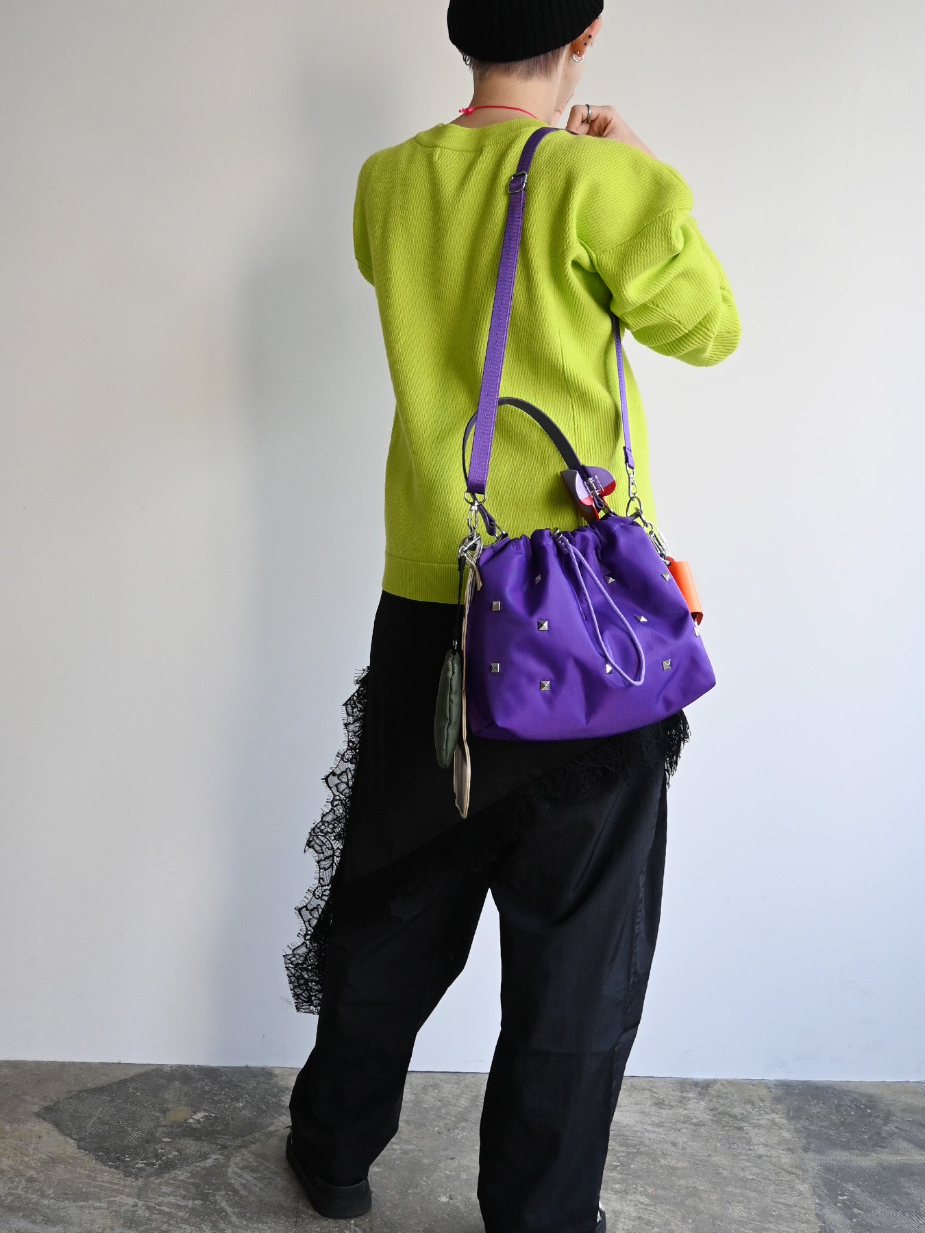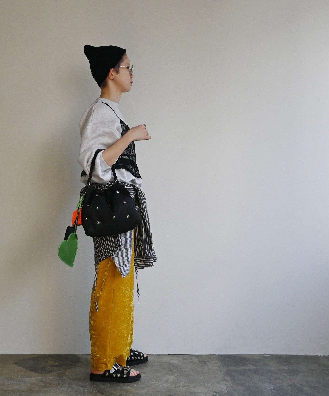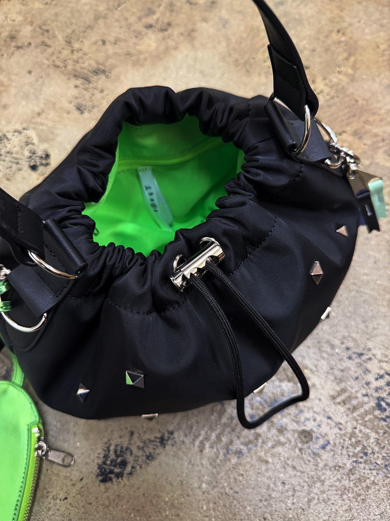 ふんわり中綿入りの本体には、スタッズを散りばめた巾着バッグ。
