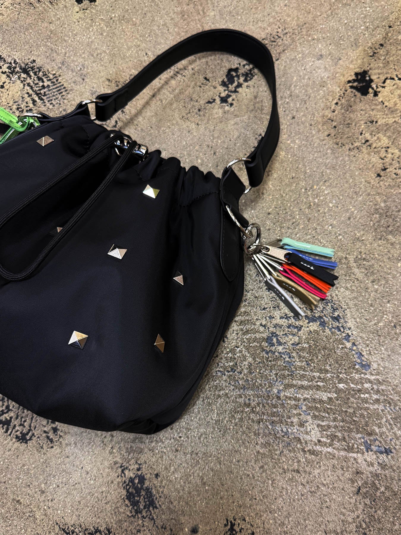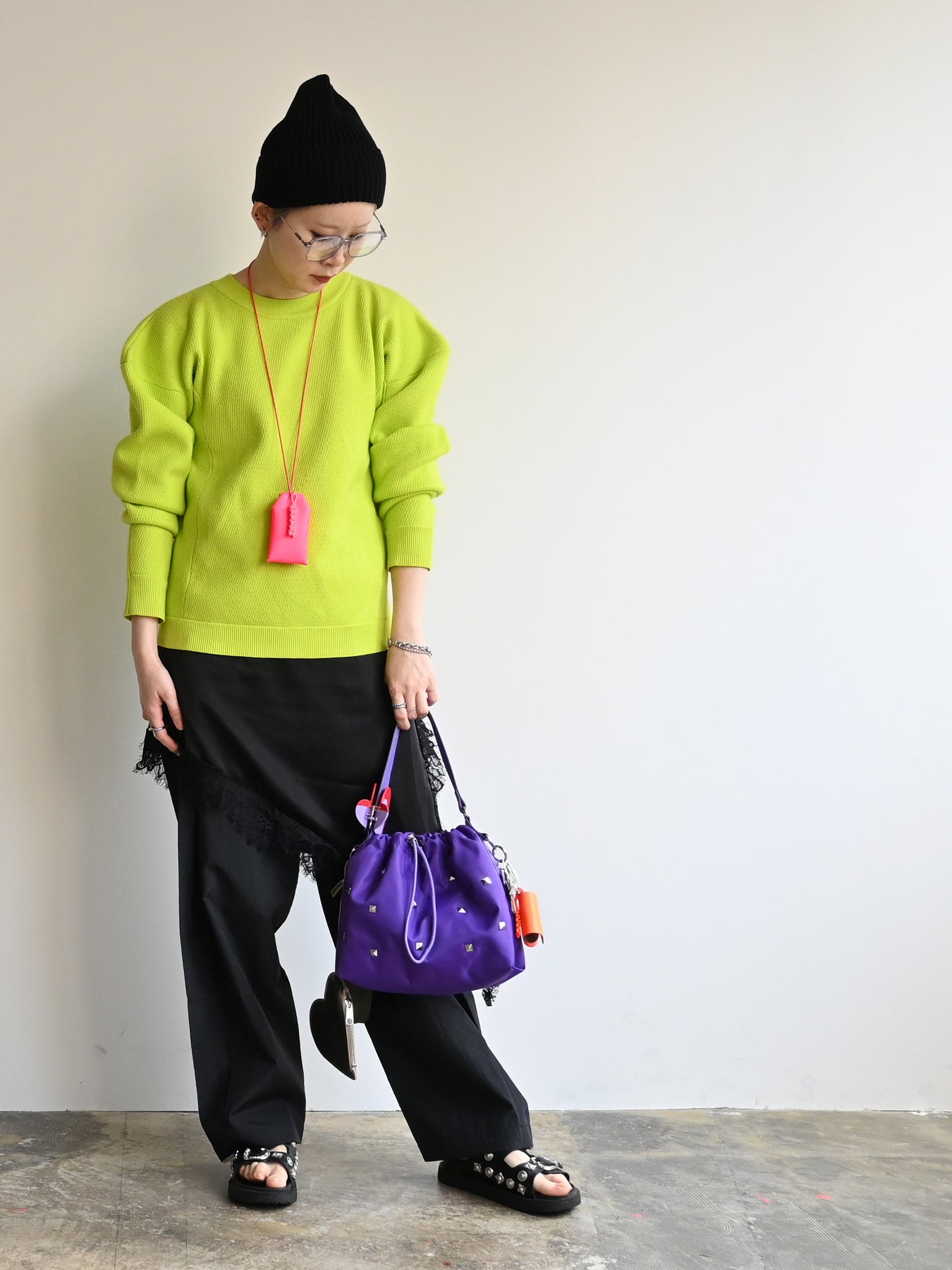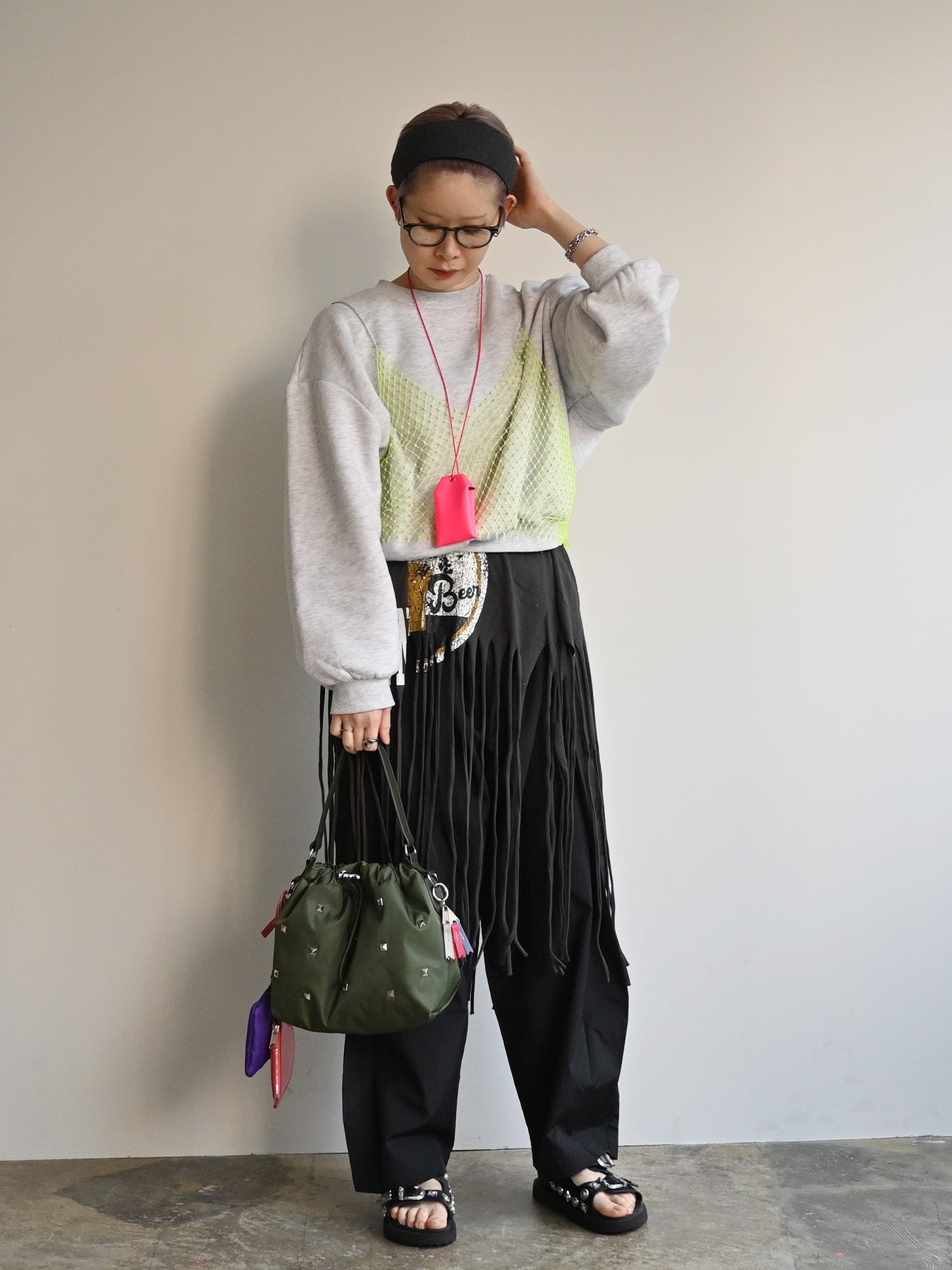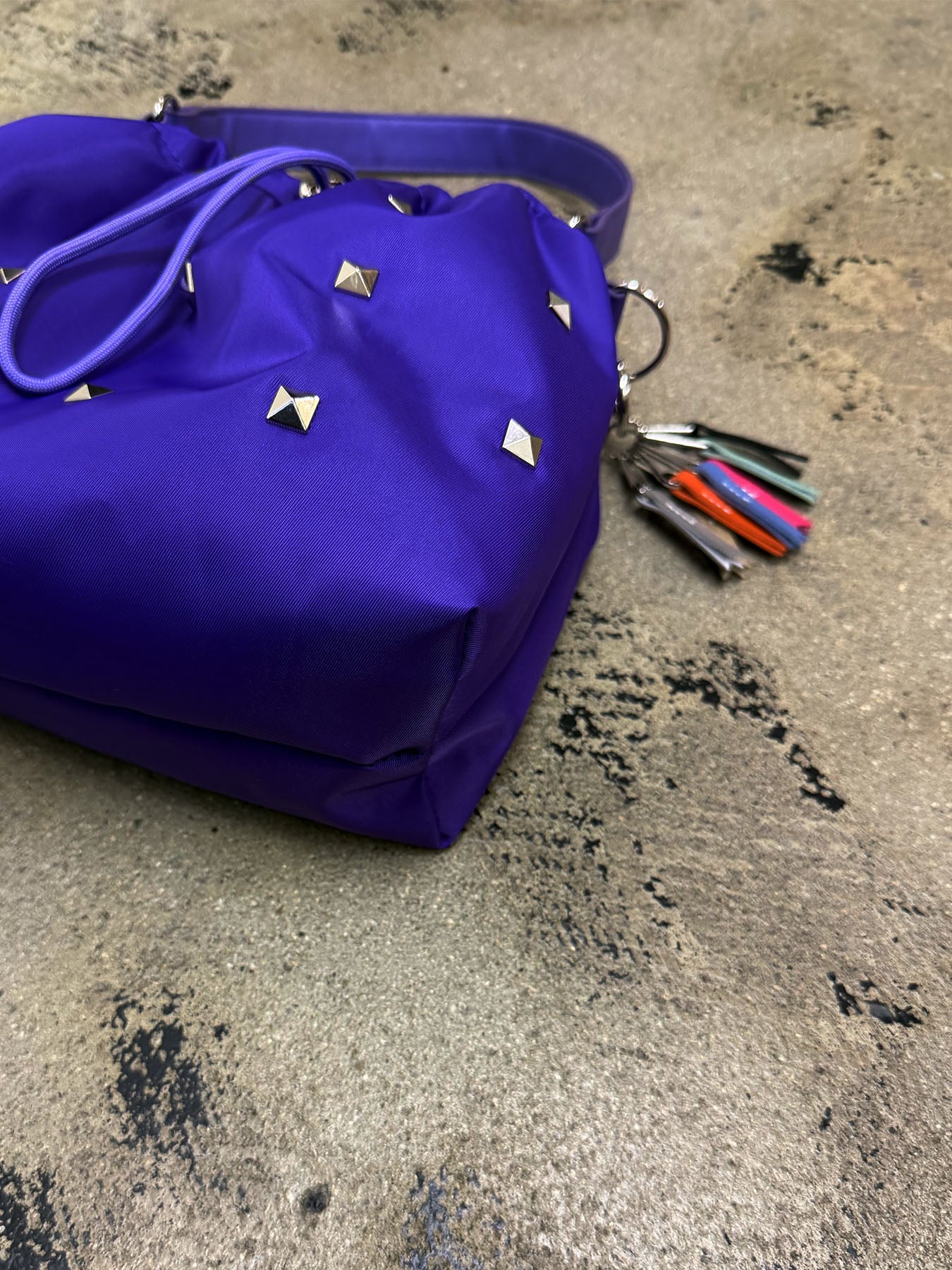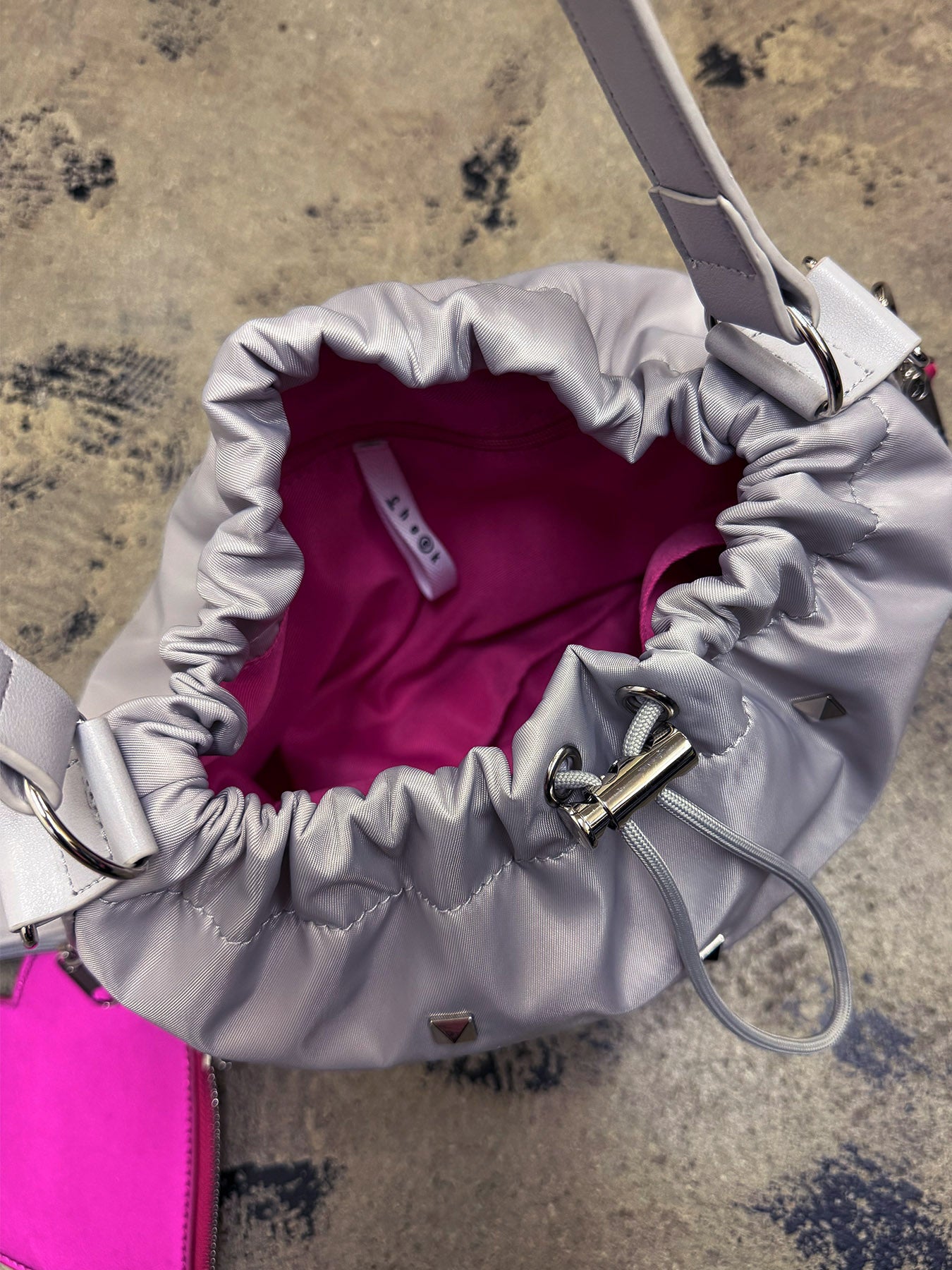ふんわり中綿入りの本体には、スタッズを散りばめた巾着バッグ。