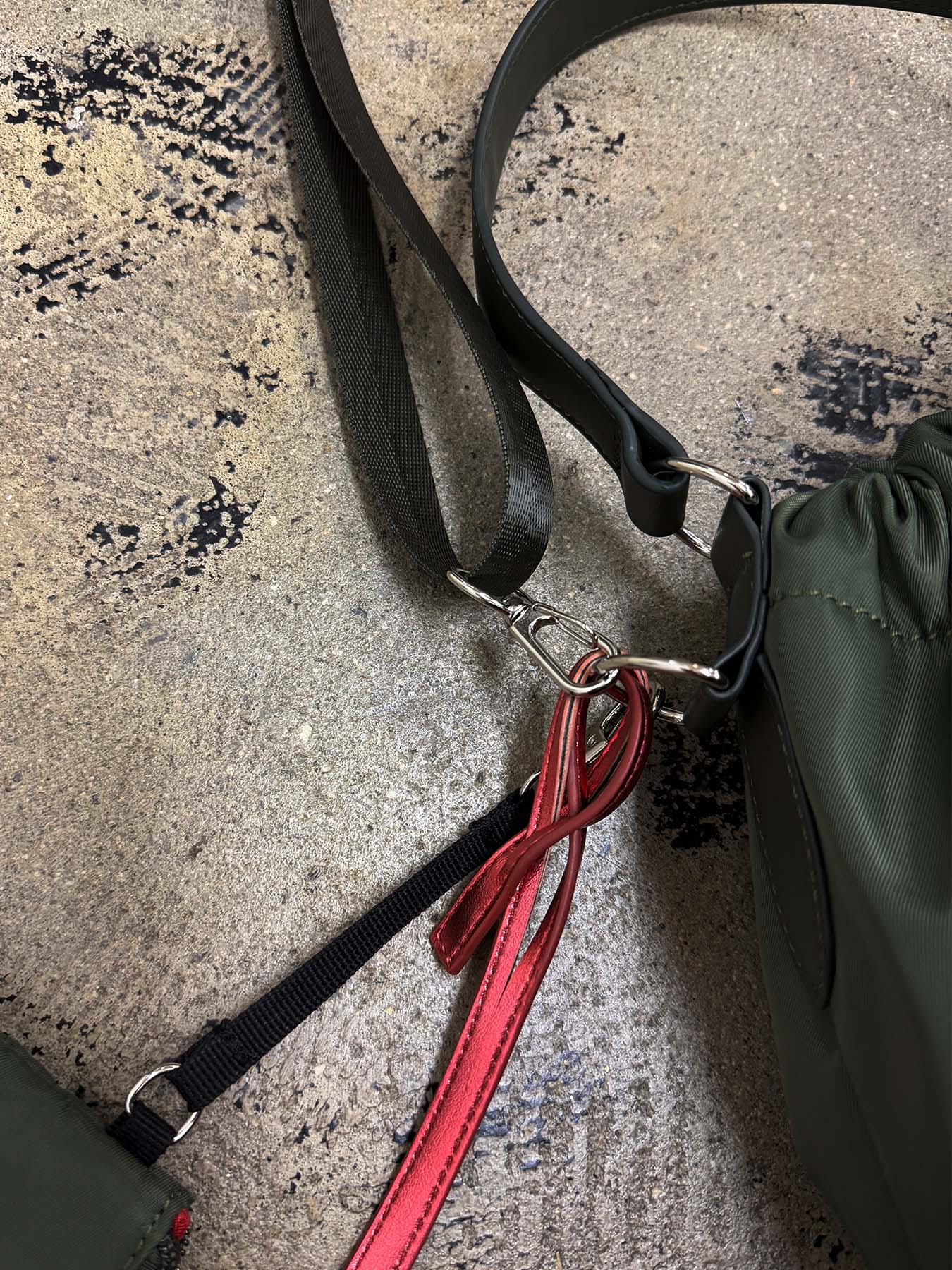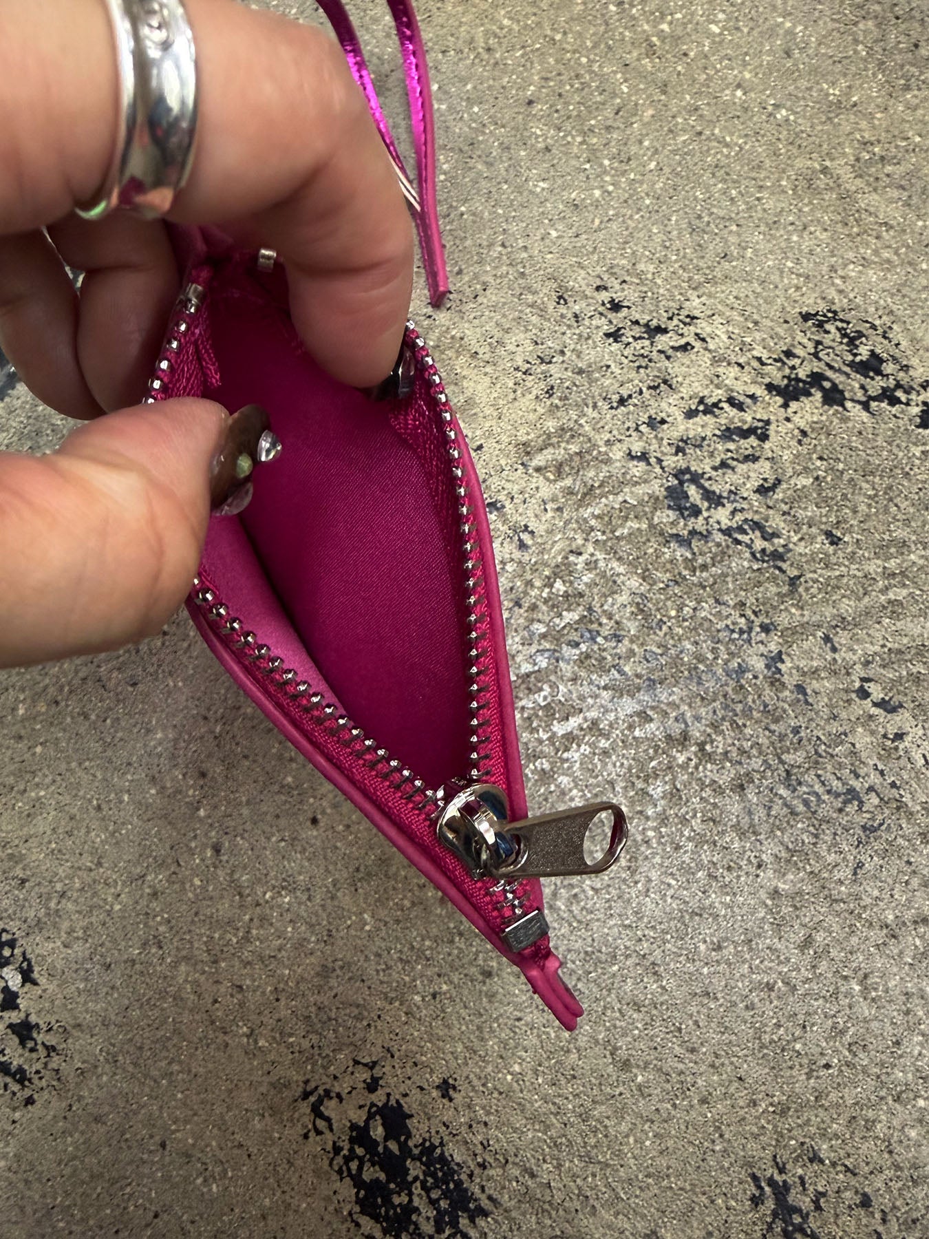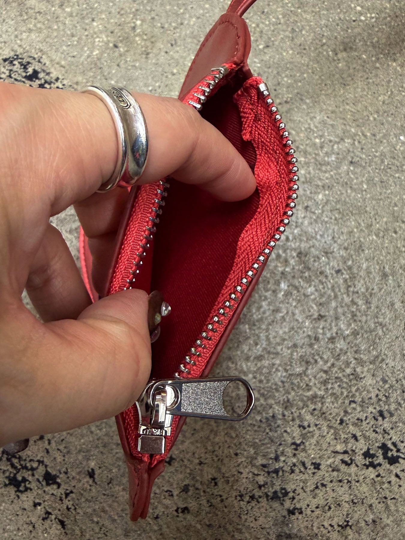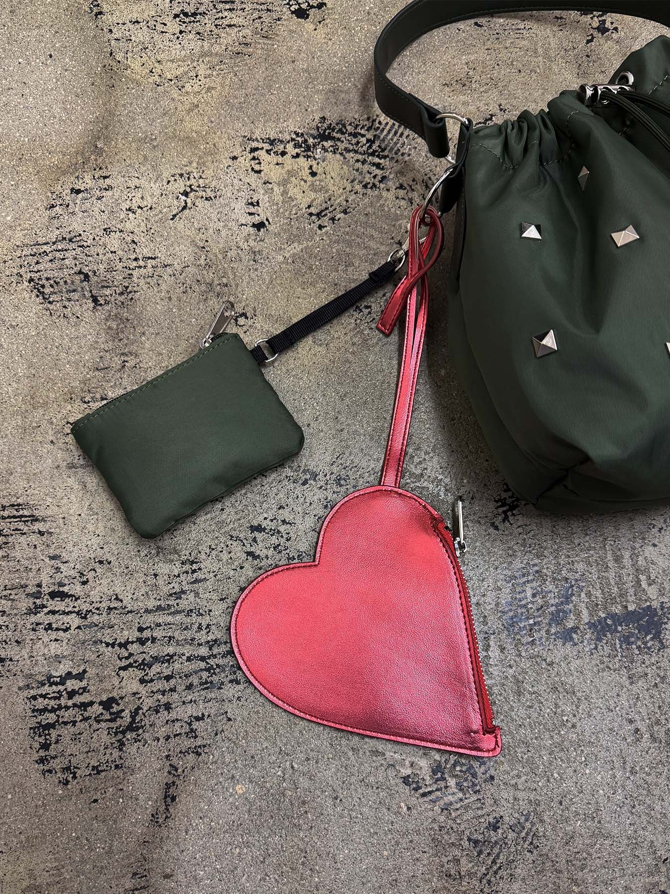 ストラップ部分にはハートモチーフポーチとミニポーチのチャームセット付き。